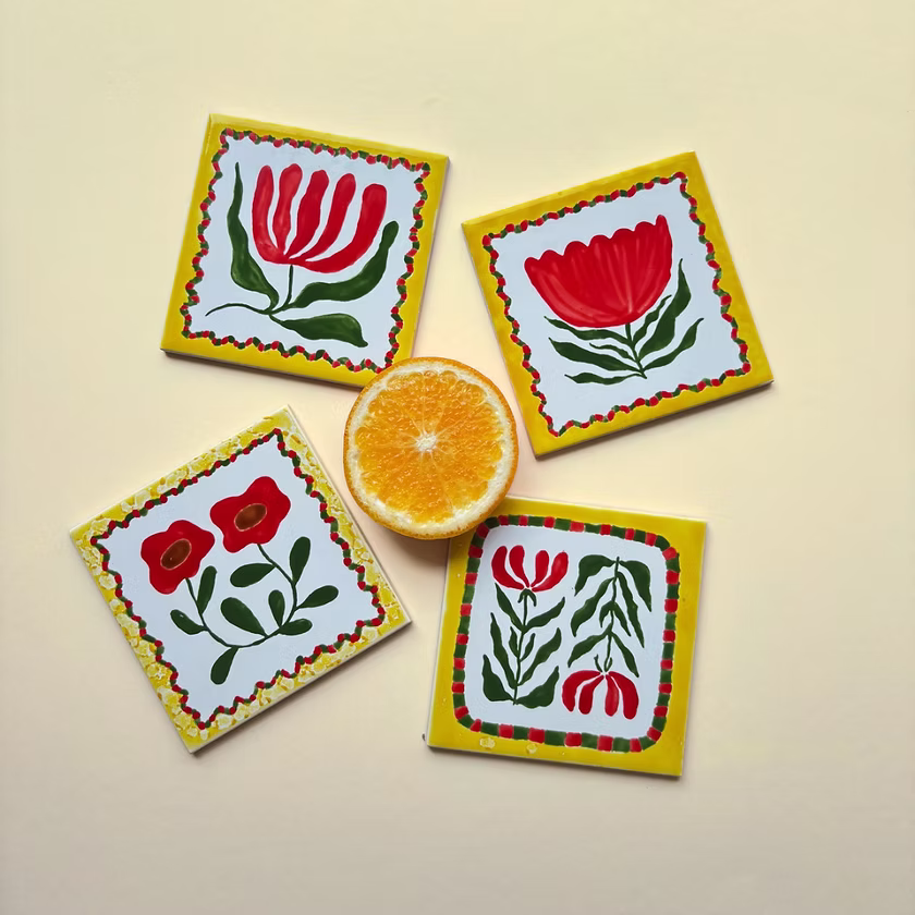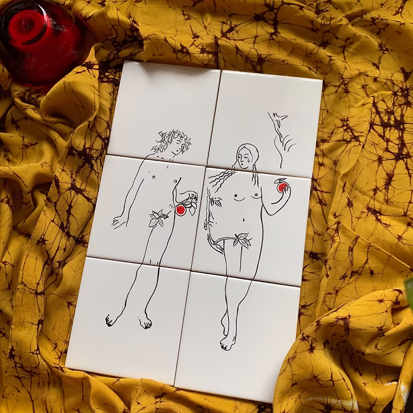 Varying in style and subject, her hand-painted tiles are mini artworks inspired by classic Mediterranean motifs, minimalist art, and contemporary tastes. Tasteful nudes in rich cobalt blue make up ‘Indigo Muse’, vibrant stylised flowers form ‘Garden Party’, and beachy scenes create ‘Hot Girl Summer’.